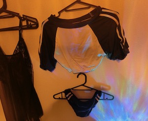 こちら、しれっと壁に飾ってあった体操服。実は、彼女オリジナルの衣装らしい。興味のある方は、オーダー可能だ。ちなみに「もっとスゴイ衣装も考え中です