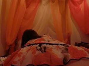 広々としてて、ピンクや赤のレースの布で装飾された感じが、なんともムーディー