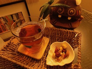 冷たいお茶と茶菓子を頂く