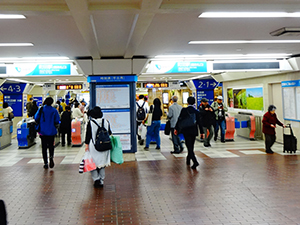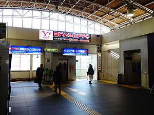 改札を出たら左前方にJRヘ続くスロープがあるので、そこを進みます。